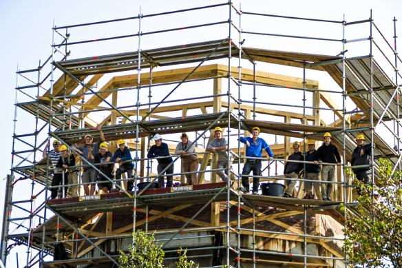 Mit großer Unterstützung des heimischen Handwerks begannen die Arbeiten am Turm im Sommer 2012. Vielfältige, oft komplizierte Arbeiten, wie der Abbau des Turmkopfes, der Ausbau des Wasserbehälters oder das Einbringen der Zwischendecken und das Aufsetzen der 25 Tonnen schwere Kopfplatte brachten angehenden jungen Handwerkern besondere Erlebnisse während ihrer Ausbildung.